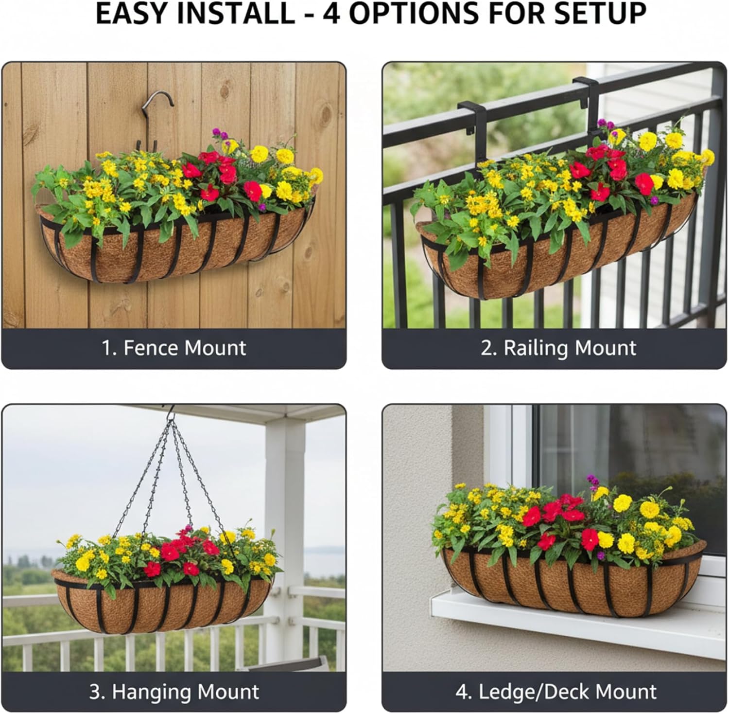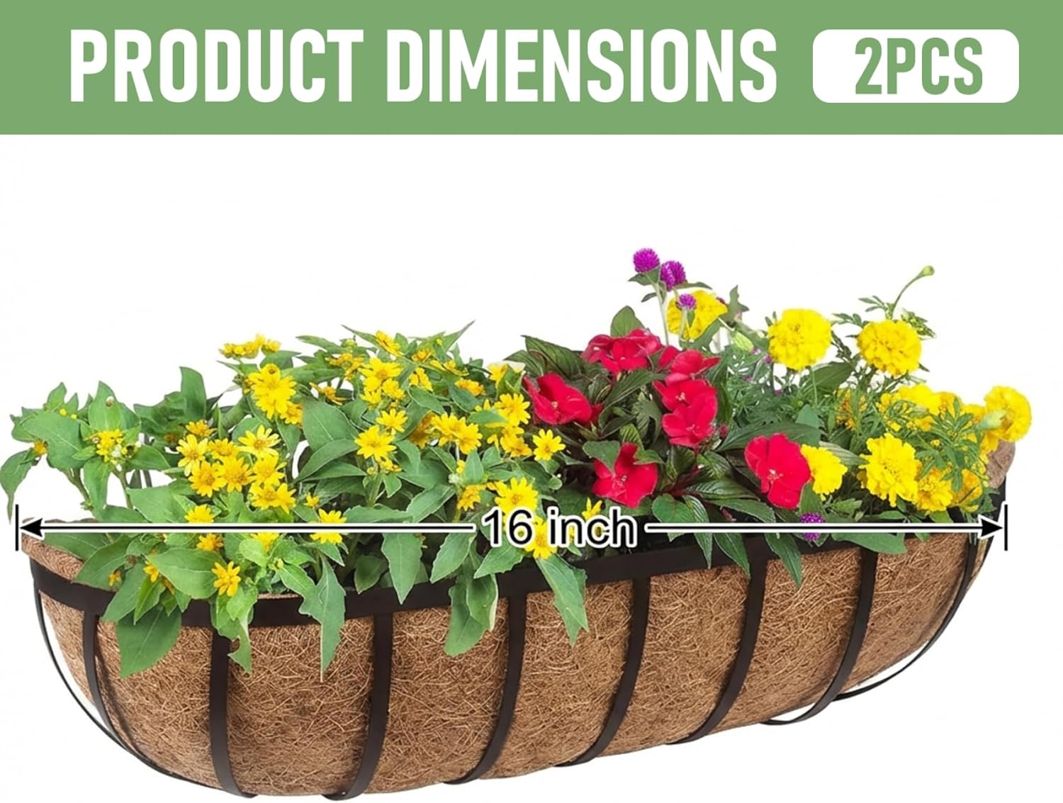 Description: Elevate your gardening and decorate your outdoor spaces with our versatile Foldable Railing Planter. Designed for convenience and durability, this planter box helps you create stunning floral displays exactly where you want them. Crafted with a robust iron frame, this planter provides a sturdy base for your plants. The frame features a sleek black powder-coated finish designed to resist rust, ensuring your planter maintains its look through sun and rain. The real star is the removable natural coconut coir (coco) liner. This eco-friendly material is not only sustainable but also functionally superior for plant health. Its open weave structure allows excess water to drain freely, preventing root rot, while also letting air reach the soil to keep roots healthy and strong. We understand that every home is different. That's why this planter comes with versatile mounting options. Use the included adjustable brackets to hang it securely over railings from 2.5 to 5.5 inches wide. For a permanent installation on a wooden fence, wall, or window sill, you can use the provided screws (anchors not included for masonry). The foldable design makes storage a breeze during off-seasons. Transform your balcony railing into a cascade of color, line your deck with fresh herbs, or add a welcoming touch of greenery under your windows. This multi-functional planter is your simple solution for adding life and charm to any vertical space. Features:. -Color: Black. -Material: Fiber. -Size: 16 inch. Note:Manual measurement, please allow slight errors on size.The colors may exist slight difference due to different screens. Package Including 2 * Railing Planter