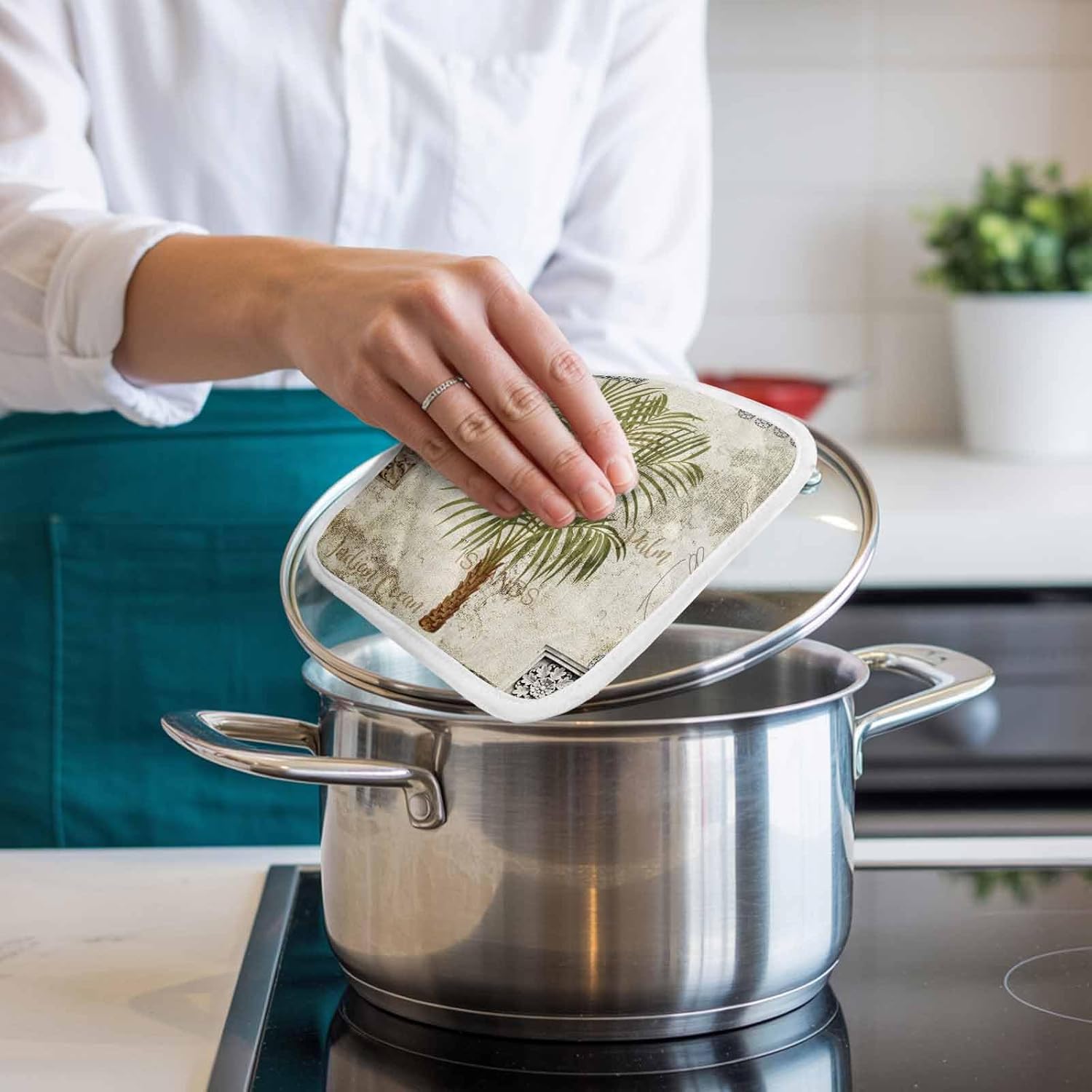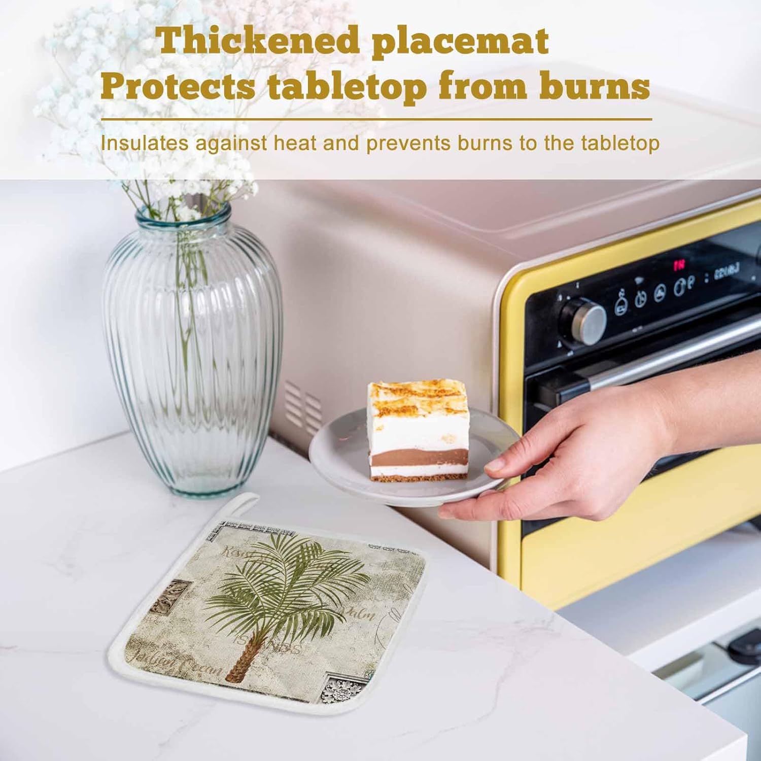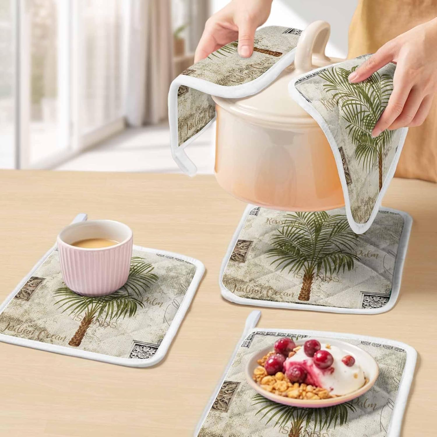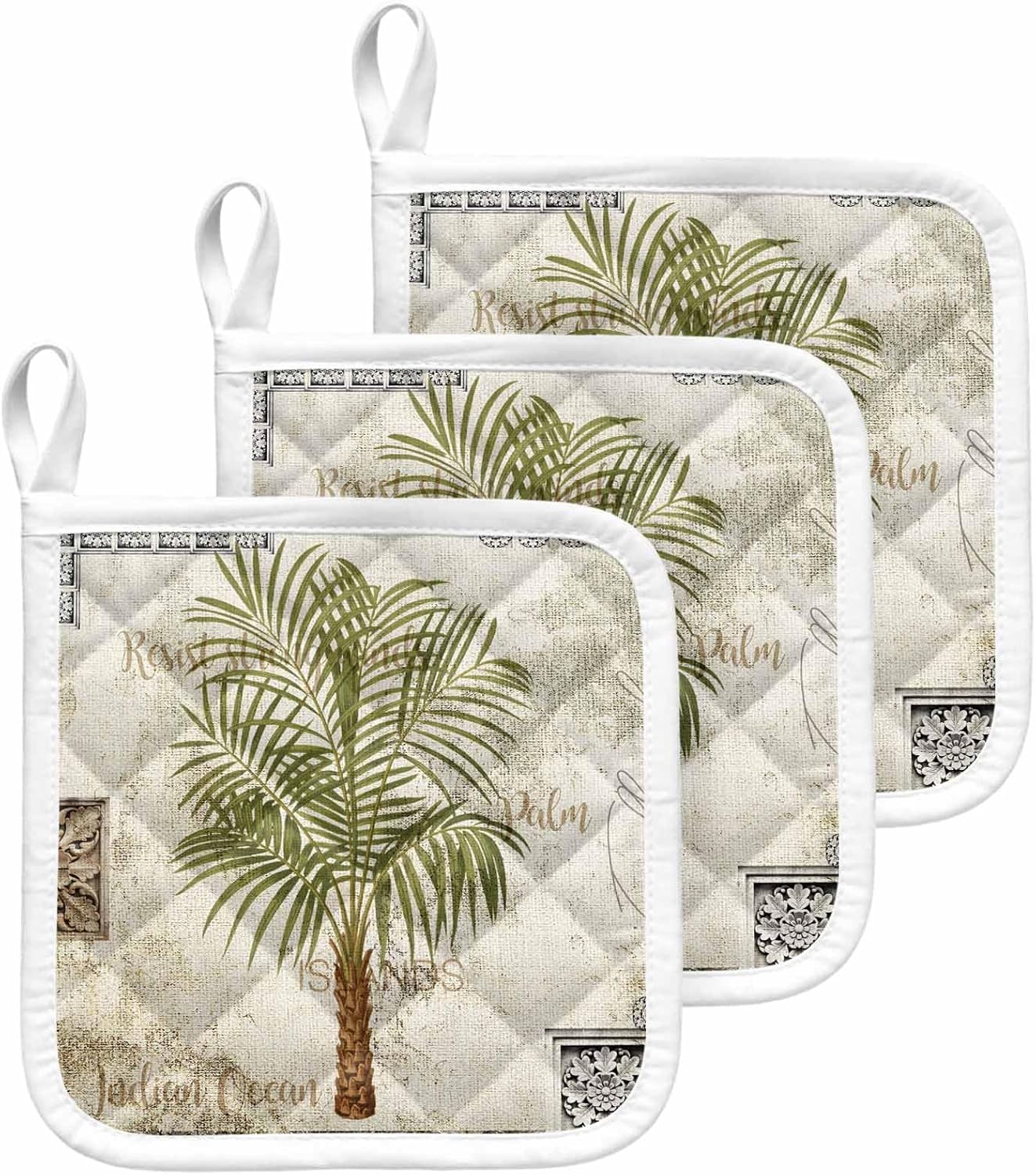 If you love cooking, baking, and grilling, pot holders are the perfect essentials for your kitchen.Let's say goodbye to accidental burns!Enjoy your cooking time!SpecificationPremium pot holders are crafted from double polyester fabric, it is soft enough to give your extra comfort. Also giving you great thickness will help shield your hands from heat. It is easy to fold, absorbent, and quick to dry.Using reinforced stitching ensures coaster potholder long-lasting durability, and quilting allows you comfortable to use while handling hot pots, pans, and lids. The Interior material will not come out after washing due to the good sewing.Pot holders with delicate patterns to make coordination with kitchen accessories easy and fun, brightening your kitchen.FunctionWell-insulated pot holders will protect your hands from getting burned while using the oven, stove, or hot grill, making your cooking time easy and safe.Pot holders can as hot pads and trivets for hot dishes, to protect your table surface from hot pots and pans.With a hanging loop outside, our potholder can be easily hung near your oven or stove, which will help you save kitchen space.Exquisite pot holders decorate the kitchen, and create a comfortable and warm cook area for you, bringing you a wonderful cooking experience, enjoy the delicious food and good family life. Start the day in a good mood.AttentionOven hot pads need to keep away from naked flame.Potholders can extend the time that you carry hot things, but do not permanently prevent heat from transferring through.Please allow for slight color variation due to the lighting camera flash and monitor setting.Since it is manual measurement, please understand that there is an error of 1-2cm.