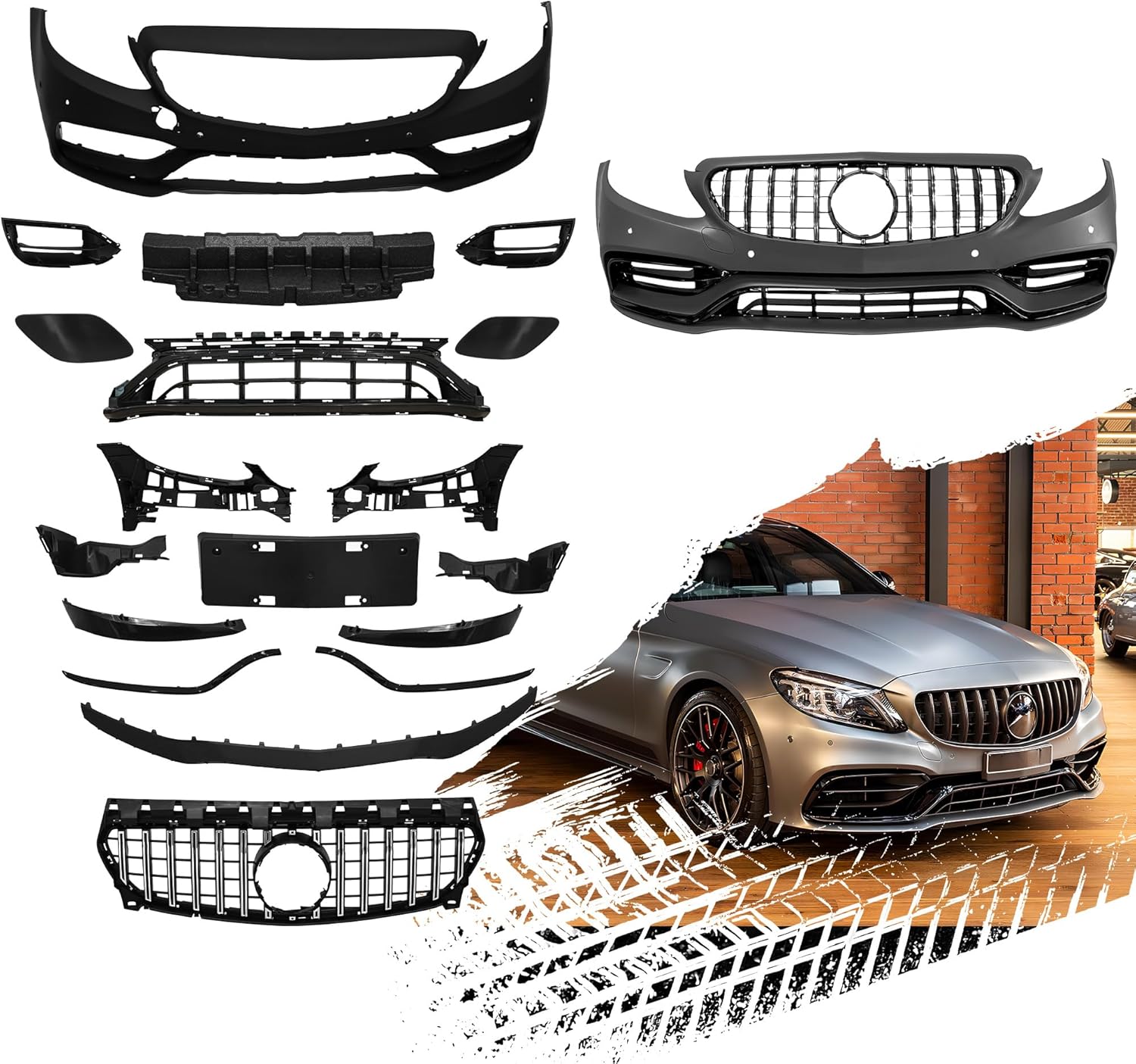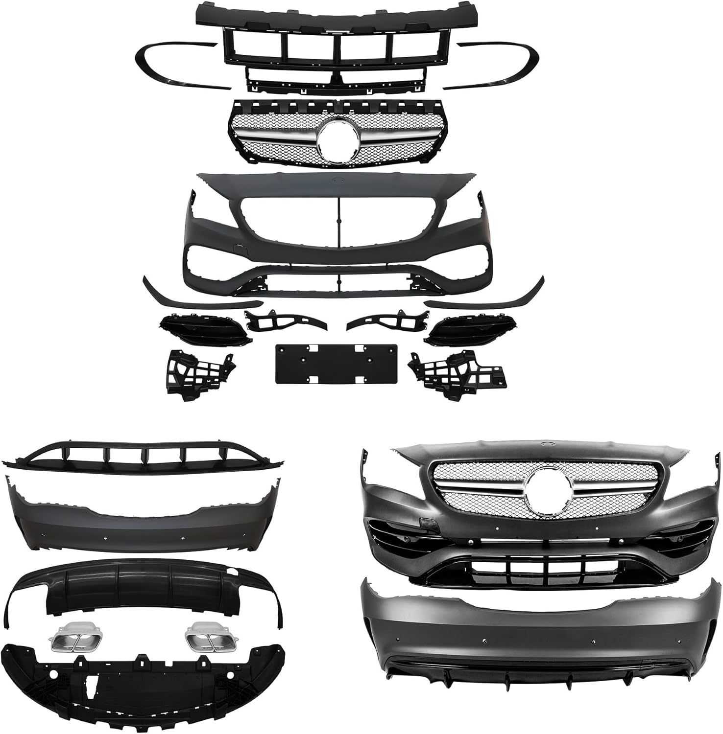This Complete Facelift Body Kit is designed to transform the exterior of 2013-2019 CLA-Class W117 models into an AMG 45 style. The kit includes front and rear bumpers, a grille, fender flares, hood, headlights, and additional body components—all crafted from flexible, durable polypropylene (PP) for a resilient fit and finish. As a direct replacement kit, it serves to enhance both the protective function and aggressive appearance of the vehicle. Suitable fit for CLA 200, CLA 250, and AMG-inspired upgrades, the unpainted black components are ready for professional installation and custom painting to achieve a seamless, high-end look.