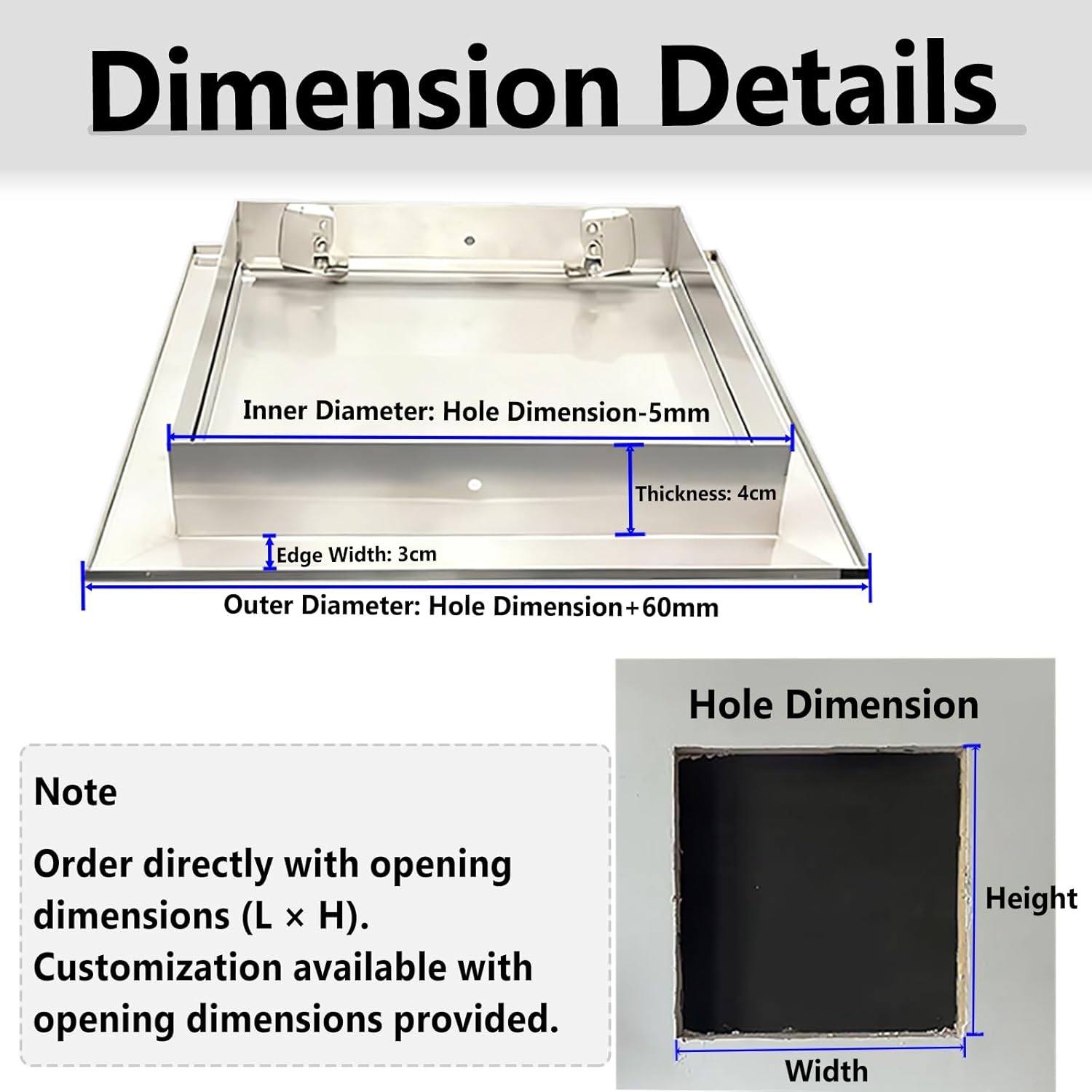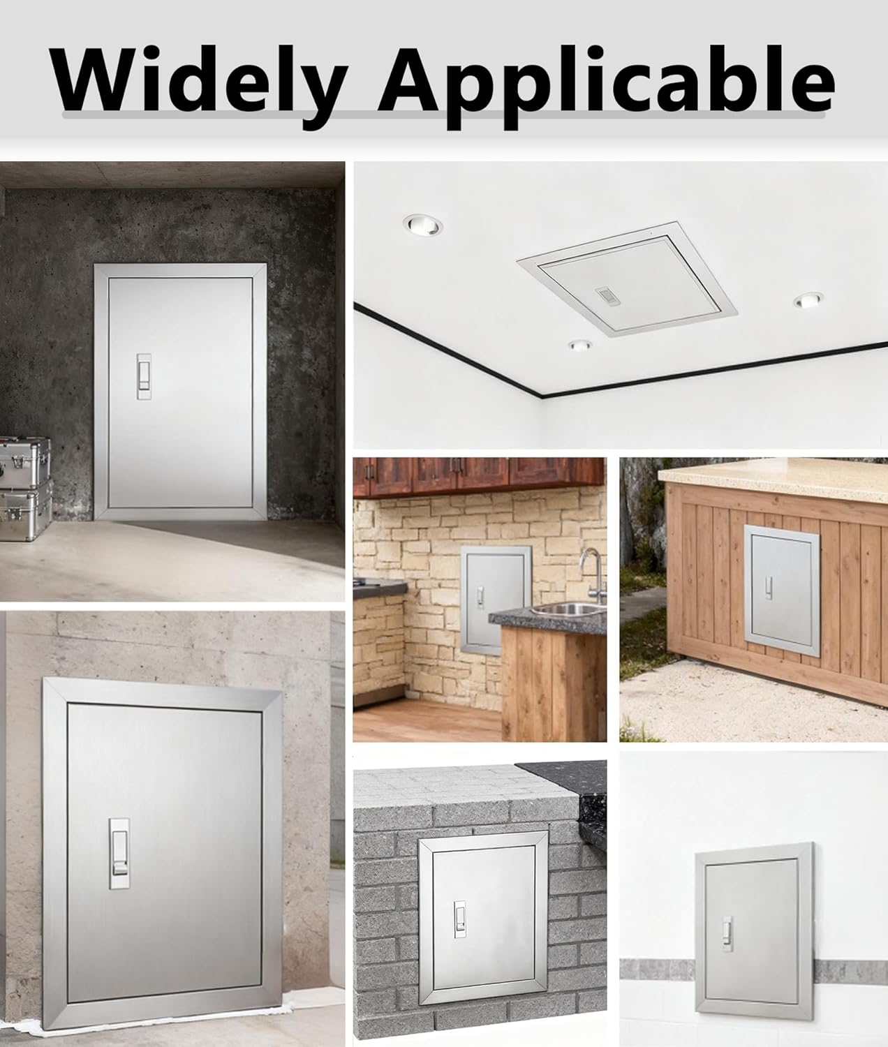 Are you still annoyed by exposed wires and pipes ruining the aesthetics of your space?This stainless steel access panel solves the problem!It not only conceals exposed pipes and cables, but its stainless steel structure also offers excellent waterproof and rust-proof properties. Combining practicality and aesthetics, it is an ideal choice for your home renovation.Specification:Material: Stainless steelUnlocking method: Press to openEdge Width: 3cmThickness: 4cmDimensions (customizable): Opening width × HeightStyle: Access door with handleCustomized service: Simply provide the opening dimensions, and we can match the best size solution for you.feature:water proofNot easily deformedWear-resistant and easy to cleanEffectively conceal electrical wires and water valves, and cover openings in walls or ceilings.Suitable for various indoor and outdoor settings such as living rooms, kitchens, bathrooms, basements, offices, and commercial spaces.Packaging contents1 x Stainless Steel Access DoorImportant Note:All product dimensions are measured manually and may have an error of 1-3 cm, which is normal.Due to differences in shooting light and screen, the actual color of the product may be slightly different from the picture. Please refer to the actual product.