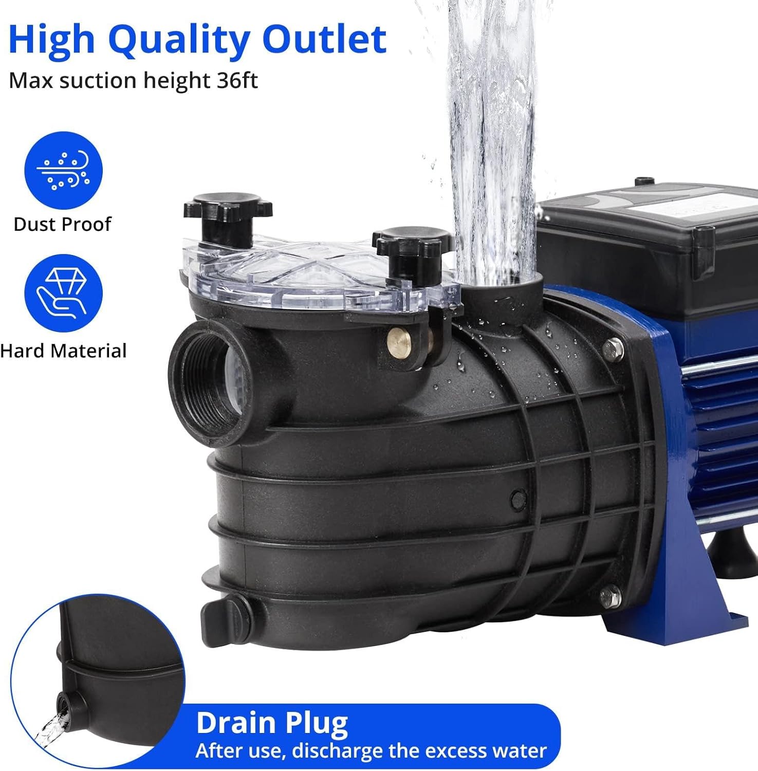 Experience ultimate comfort with this 3/4 HP Pool Pump for in/above ground pools. Enjoy efficient performance with a 2641 GPH rate and thermal overload protection. Built to last with a pure copper motor and stainless-steel shell. Say goodbye to noisy pumps and hello to a peaceful swimming experience.