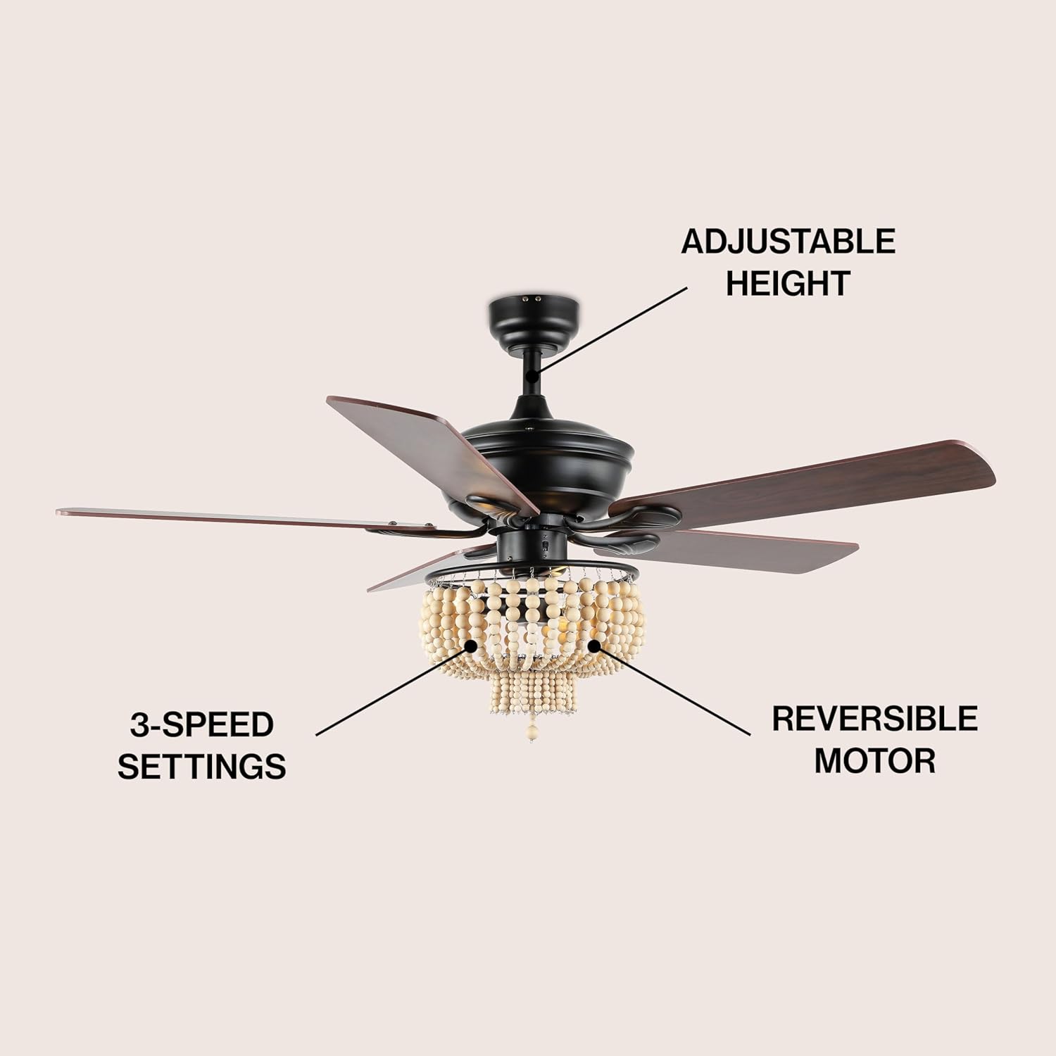 Our 52" fan features a dome light shaded by strings of wooden beads that give it a rustic, coastal-Bohemian vibe. The versatile black finish suits almost any decor. Includes three LED bulbs for bright, sparkling light.