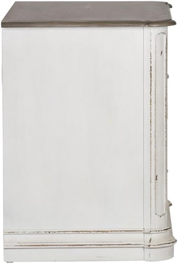 Indulge in the perfect blend of European design with the Magnolia Manor Jr executive media lateral file. Crafted of poplar solids with white oak and birch veneers, this piece features canted corners and two fully stained full extension drawers with a lock system keeping valuables secured, wood framed drawer fronts, bead molding, and is accented by bail pull hardware in an antiqued pewter. The top is finished in a weathered brown with whitewash and has rounded pilasters. Warm antique finishes and artistic distressing along with grand scale create a piece to be passed to generations.