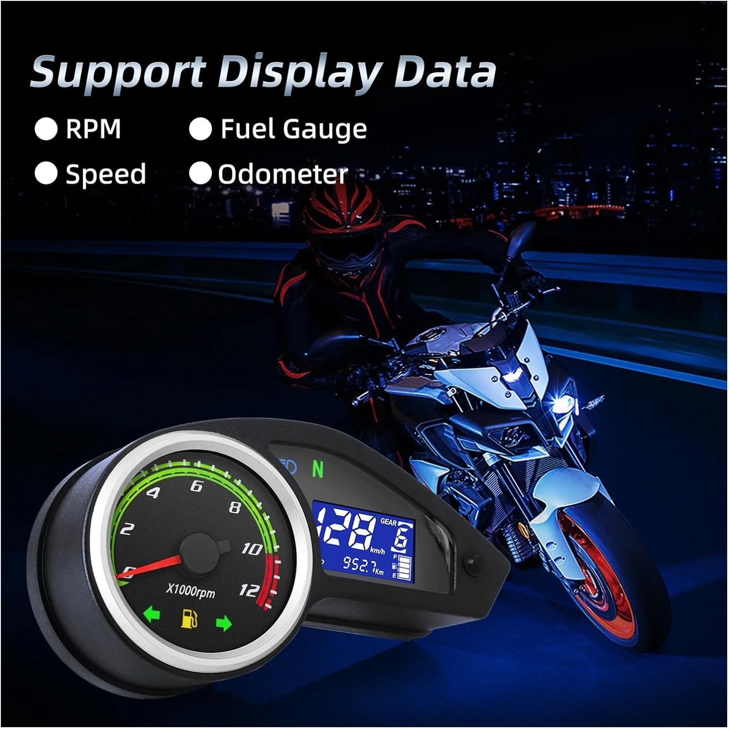 Universal Motorcycle Tachometer Digital Dash With 12000RPM Taachometer Odometer Fuel For GY200 For All 12V Motorcycle-Made of materials that keep it looking bright no matter how bad the weather gets.-Bright LED light indication, the dial is clearly visible when riding in the dark.Tachometer with colorful lights for night riding Applicability: Universal for most DC 12V motorcycle models Packaging: 1 x Motorcycle Gauge Material Type : Plastic Model Name : Motorcycle TachometerFunction: The motorcycle odometer helps to better understand the vehicle conditionPurpose: The clear screen of the motorcycle dashboard tachometer provides you with a wider viewing angle and relieves eye fatigueHope you can buy your favourite products in the shop, welcome to the next visit.