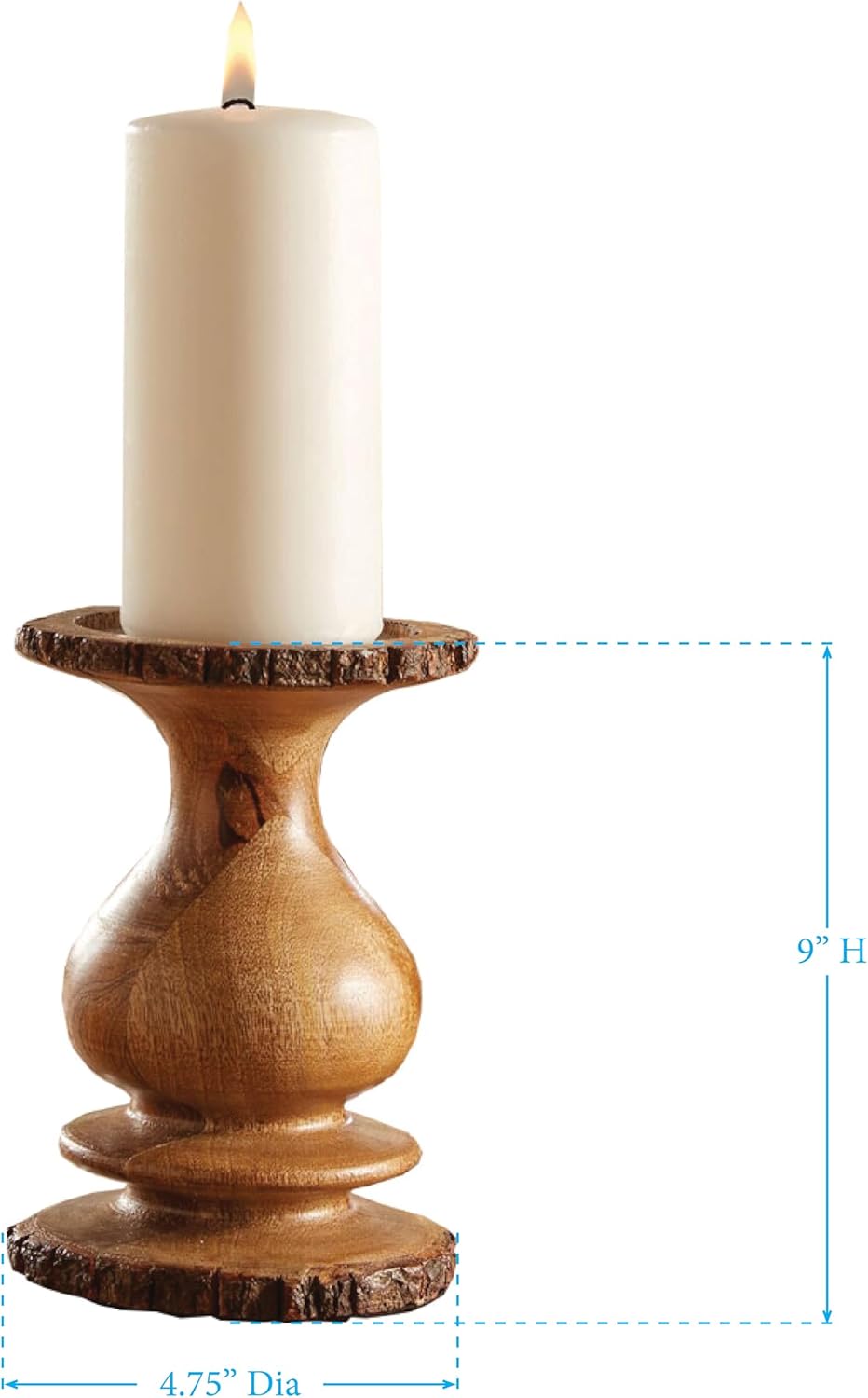 Add rustic charm and style to your home decor with this rustic pillar candle holder. This natural candle holder features turned mango wood with a bark edge trim at the top and bottom. Showcase your favorite scented or unscented pillar candle with this sturdy and durable display. Perfect for creating an intimate and inviting atmosphere by arranging with decorative tabletop pieces, seasonal accents, and other accessories.