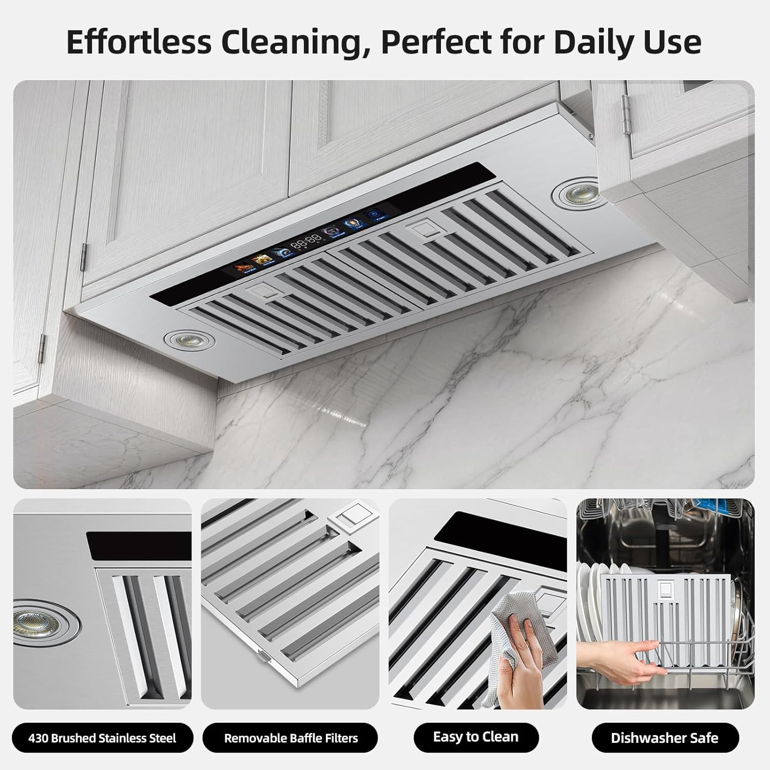 | Additional Features | 900 CFM Powerful Suction, Adjustable LED Light Brightness, Delay Shut-off, Remote/Voice/App/Gesture/Touch Control, Stainless Steel Baffle Filters |