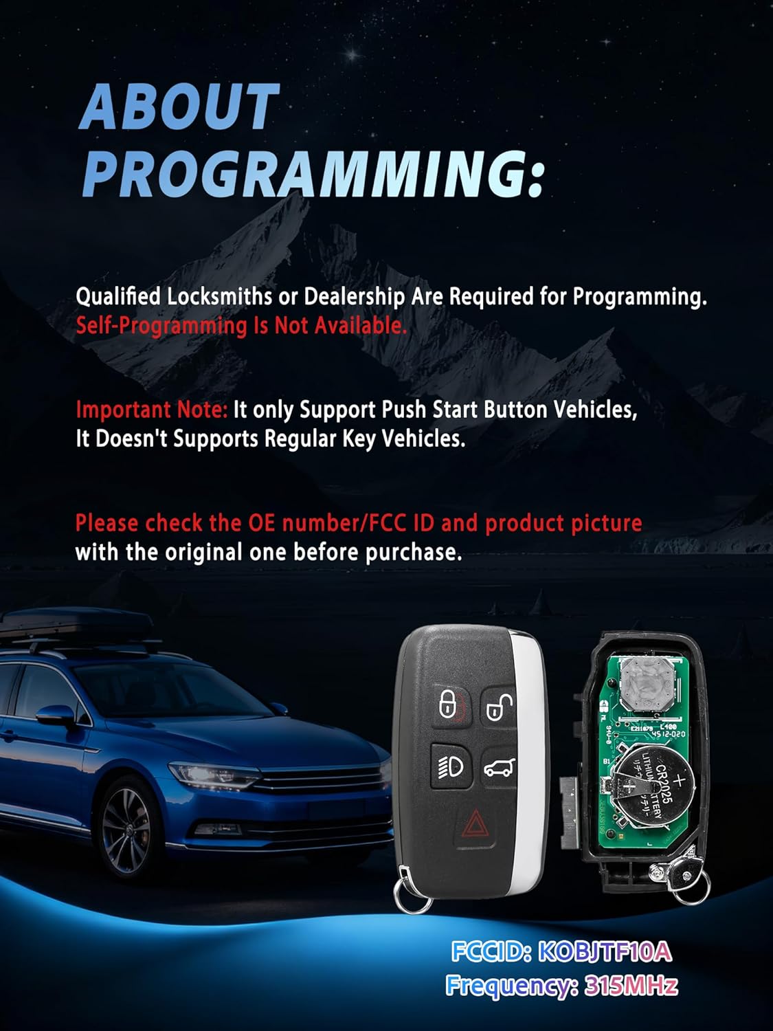 • 【Compatibility】For 5 Buttons Key.This remote key Fob Replacement is only compatible with 2012-2017 Range Rover/Range Rover Evoque/Range Rover Sport/2015-2018 Discover/2016-2018 Discover Sport/2012-2015 LR2/2012-2016 LR4;For 2014-2020 Jaguar F-Type/2017-2020 Jaguar F-Pace/2011-2017 Jaguar XJ/2013-2018 Jaguar XF/2017-2018 Jaguar XE etc.Please make sure that the appearance of your original key matches our key fob.