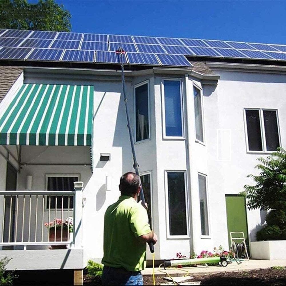 Are you looking for a practical and inexpensive solution to clean those tall windows or solar panels?This product is an ideal choice! This is a fully expandable, water-filled cleaning system. Can be connected to a clean water system or a garden hose.>>>Features:✔ Multifunctional water spray brush, high-altitude cleaning.✔ Using high-density reinforced aluminum alloy, high hardness, not easy to rust and light weight. It will not bend even if it is 10 meters long.✔ The steel buckle is fixed for easy installation and removal.✔ Shatterproof connection design can be used with a variety of cleaning tools to perform high-level cleaning operations.✔ Pure copper switch, anti-corrosion and more durable.✔ Universal design, the brush head can rotate freely.>>>Product parameters:Material: aluminum + carbon fiberBrush width: 32cmLocking method: twist lockWater supply hose: 20MSpecifications:12FT/3.6m,18FT/5.4m,20FT/6m,24FT/7.2m,30FT/9m,36FT/10.8mScope of application: window cleaning, photovoltaic panel cleaning, bus / exterior cleaning, large vehicles, trucks, trucks, caravans, boats, etc.>>>Products include:1 * telescopic rod1 * brush head1 * Angle Adjustment Connector1 * Three Way Split Plug1 * quick connector1 * Locking Mechanism Adjustment Tool1 * water supply hose>>>Please note:Manual measurement of this product may have an error of 1-3 cm, which is a normal difference.If you have any questions, please email us. We will reply you within 24 hours and provide you with the best service.