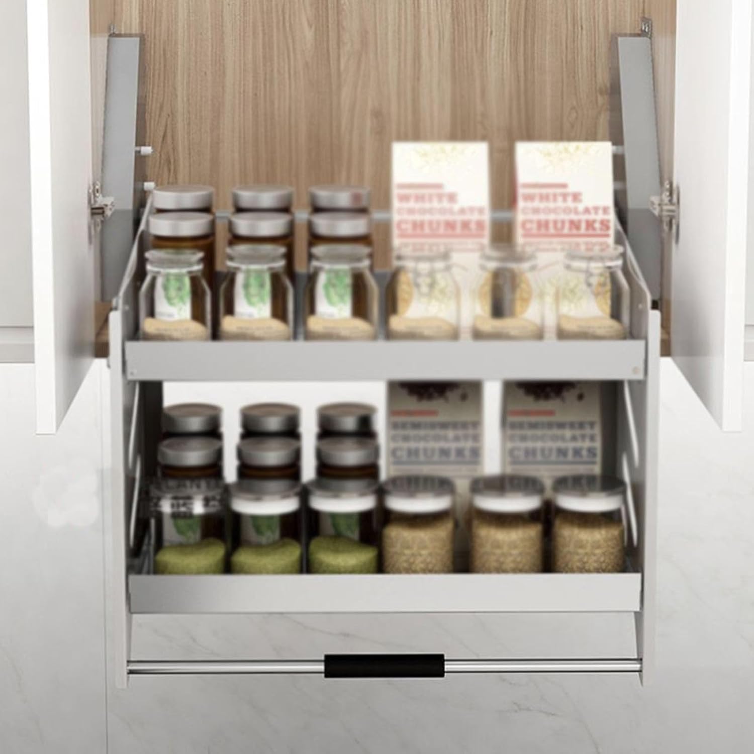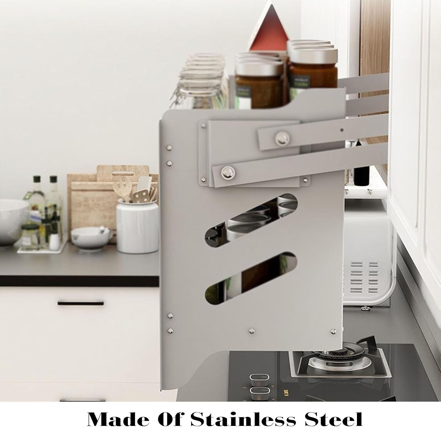 Our pull-out cabinet shelves are made of stainless steel, ensuring strong load-bearing capacity. The convenient pull-out design eliminates the need to climb, making it easy to access your items. The pull-out design makes full use of hard-to-reach upper cabinet space, effectively maximizing cabinet space utilization. Pull-out cabinet shelves are suitable for kitchens, bars, wardrobes, and other appropriately sized wall cabinets.Specifications:Product Name: Pull-down Cabinet Storage Rack, Pull-down Shelf, Heavy Duty Pull-down Cabinet Storage RackColor: As shown in the picture.Package List: Pull-down cabinet storage rack x 1, other installation accessories.Precautions:1. Due to manual measurement, the actual size may have an error of 1-2 cm.2. Due to shooting resolution and screen display differences, there may be slight color differences. Please refer to the actual product color.3. Safety Warning:Please ensure the shelf is correctly installed and securely fixed to the cabinet. Do not overload the shelf.