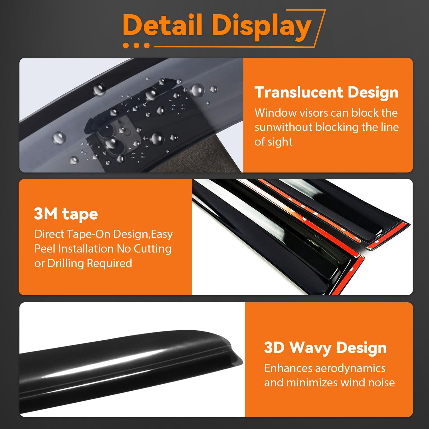 Features: * Outside Mount Style (Stick on to the door & above the windows.Not In-Channel Style) * Brand new in box. * Fully window protected from sun shade, wind, rain, snow deflector. * Help reduce heat buildup in park vehicles by allowing air in when partially open. * Long lasting material designed to withstand the rigors of the elements. * Make it possible to leave the windows down a few inches to get fresh air even on rainy days. * Comes With Genuine 3M Automotive-Grade Double-Sided Tapes.Easy Installation. * Dramatically Improve Styling & Appearance.