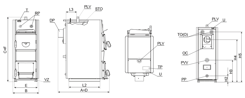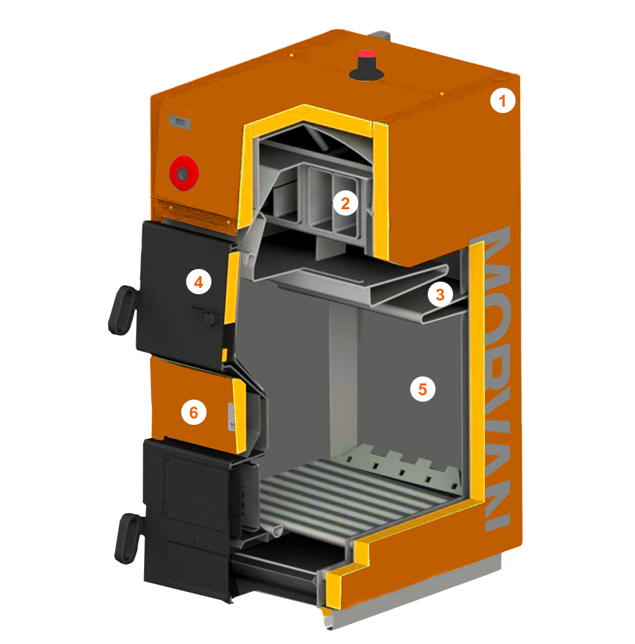 - Chaudière à bois à tirage naturel, combustion montante avec triple parcours des fumées garantissant un très bon rendement.