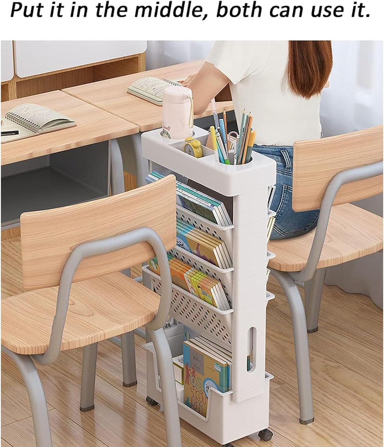 Moveable Book Cart Constructed with 4 casters with 360° rotation and 2 of them are lockable. Rolling design allows easy movement in your workplace and locked in place for secure use when it's stationary. Movement of the cart becomes easy even in limited spaceFunctional Utility Shelf Rolling organizer cart can be an file or paper sorter organizer for office, utility organizer for kids' picture books in nursery, book shelf for teachers in classroom, and art supply organizer for artist students to organize drawing paper and paint tools. Great for home, office, classroom, dorm organizationSlim File Storage This file storage cart is only 5.9 inches wide. With the slim construction, the rolling paper file cart fits easily in narrow spaces in your office while still meets all needs for documents and files storage and organizationMaximize Organization With 5 tiers shelfing baskets, the rolling book cary provides ample storage space while allowing you to keep your necessities close. Put your pen holder, water cup and small utilities on the top. And all magazines, notes, evelopes, books, files, documents, bills and papers on the underneath 4 tiersEasy to Assemble The rolling book cart with wheels is easy to install, all parts are included. It provides enough storage space for your daily life, optimize space utilization, and make the messy room tidy, a must have for your home office