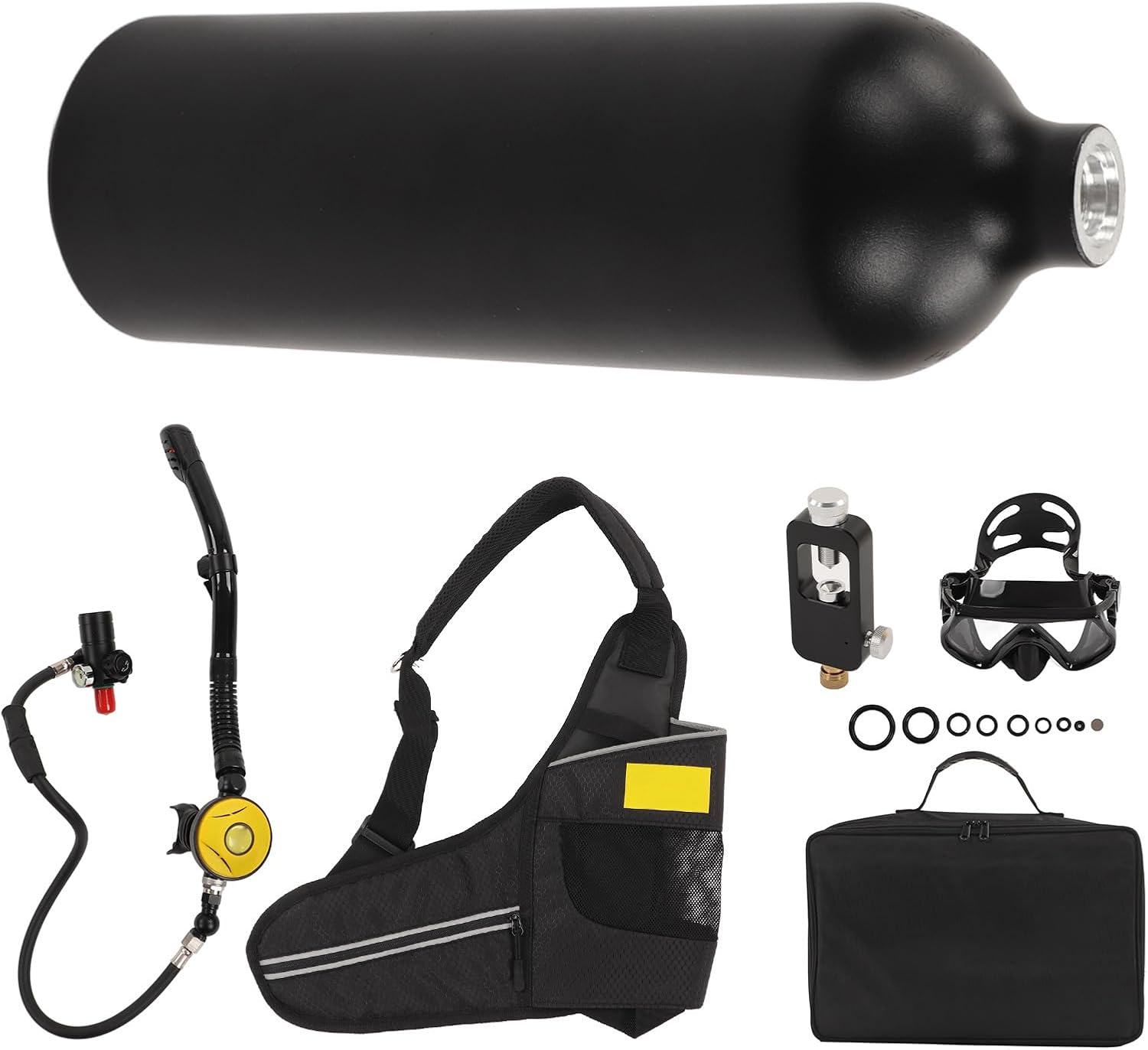 [EASY TO USE] Experience the charm of the sea with this lightweight and comfortable diving equipment. Simply put the mouthpiece in and enjoy hands-free underwater exploration.[SAFE DIVING] Equipped with multiple rotation valve heads and a master valve control switch to ensure a secure and hassle-free diving experience.[PRESSURE RELIEF VALVE] Features a pressure relief valve, one-way gas filter, and a luminous pressure gauge for pure oxygen breathing even at 80 meters depth.[ERGONOMIC DESIGN] Liquid silicone mask straps and PC lenses provide a secure and comfortable fit, while the adjustable button reduces pressure on the head for easy wear.[PORTABLE ADAPTER] Easily switch from large to small bottles with the reliable ball lock design, eliminating the need for bulky scuba gear and making diving simple and convenient.Spec:Item Type: 1L Portable Scuba Oxygen Cylinder Diving RebreatherMaterial: Aviation Aluminum 6061, Rubber Hose, Food Grade Silicone MouthpieceGross Weight: 4180g / 147.4ozOxygen Cylinder Size: Height: Approx.28cm / 11.0in, Diameter: Approx.9cm / 3.5inHose Length: 65cm / 25.6inHandbag Size: 44x30x10cm / 17.3x11.8x3.9inPressure Reducing Valve Thread Size: M18 x 1.5 with 360 degrees rotating headOxygen Cylinder Specification: 1LInflatable Safety Pressure: 3000PSI, 200BAR, 20MPAAvailable Time: 15-20 minutes (depending on individual lung capacity and individual diving skills)Applicable People: Professional diving (spare gas source); amateur diver; lifeguard firemanCarrying Mode: Just disassemble the bottle body and pressure reducing valve after pressure reliefPackage List:1 x Pressure Relief Valve and Hose and Breather Kit1 x 1L Oxygen Cylinder1 x Oxygen Bottle Strap Bag1 x Scuba Adapter1 x Diving Googles1 x Consumable Parts Kit (9 accessories)1 x Multilingual Manual1 x HandbagNote: